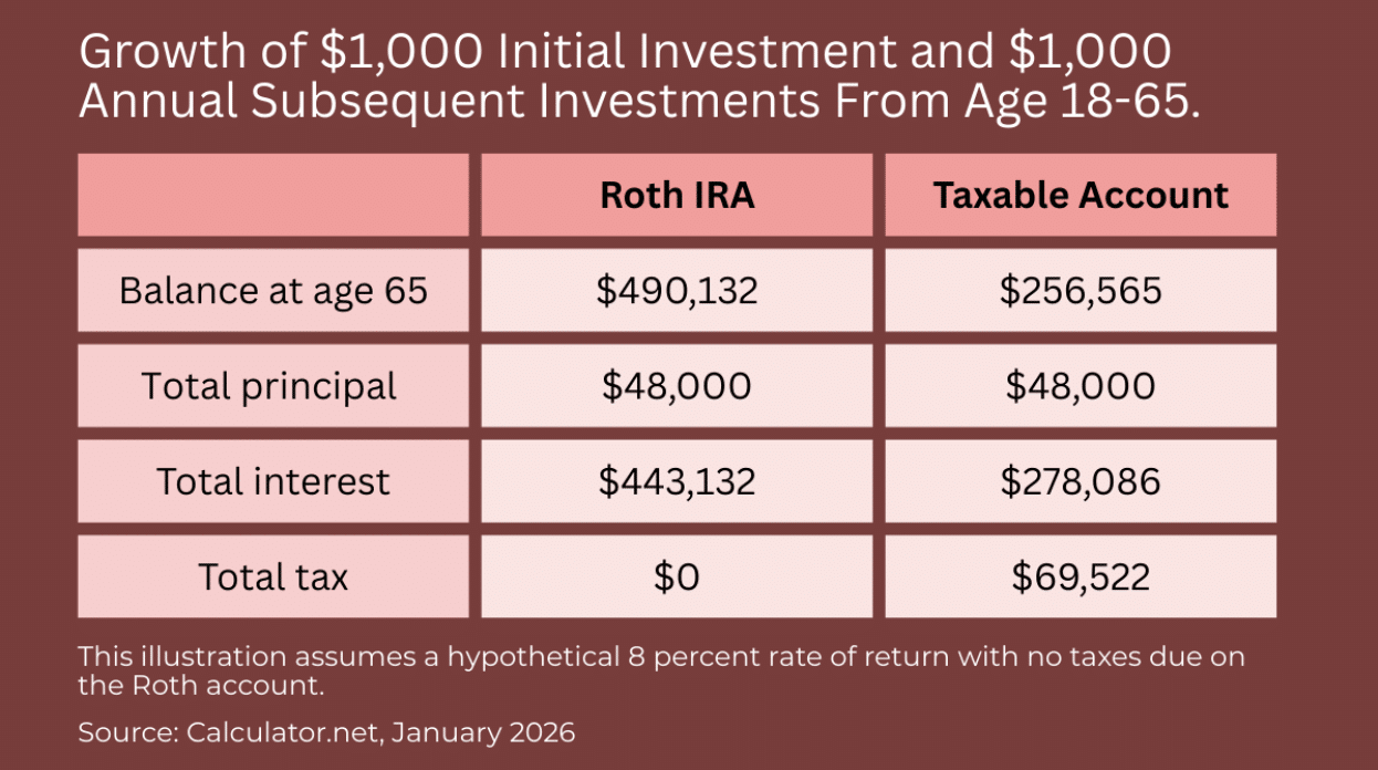 For example, if your child opens a Roth IRA at age 18 with a $1,000 initial investment from a part-time job and adds just $1,000 per year thereafter, assuming a hypothetical 8 percent average annual return, the account would be worth nearly $500,000 when your child turns 65. Remember, Roth IRA contributions are made with after-tax dollars, so there are no taxes on qualified distributions in retirement.1