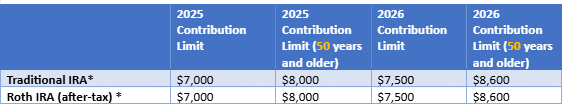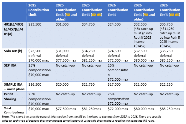 Contributing to a tax-deferred retirement account can reduce your taxable income. Contribution/deferral limits for 2026 have been announced by the IRS and can be seen in the chart below alongside 2025 limits. Take advantage of 2025 limits before year end and set up accounts to take advantage of 2026 deferral limits in the new year.