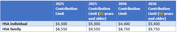 Health Savings Account contribution limits will increase in 2026 for individuals and families. The catch-up amount for people aged 55 and older stays at $1,000 for individuals and families. Learn to make the most of a Health Savings account by reading our blog here.