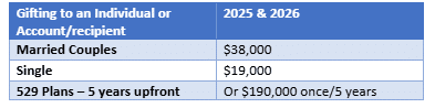 In 2026, the federal estate and gift tax exemption will be $15 million per person (or $30 million for married couples). If you are near or above these thresholds, making annual gifts of up to $19,000 per recipient is an effective way to gradually reduce your taxable estate.